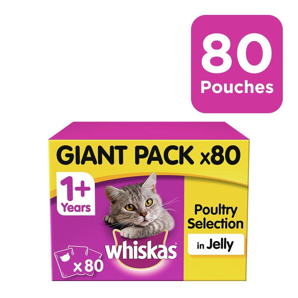 For more information on feeding your cat please contact our consumer. 2 25 g we recommend to feed a mix of whiskas wet and dry food. Adjust the amount of food to the level of activity and body condition of your cat. Whiskas poultry in jelly adult 1 wet cat food pouches 80 x 100g giant pack delicious adult cat food slices for a convenient and fresh feline meal.